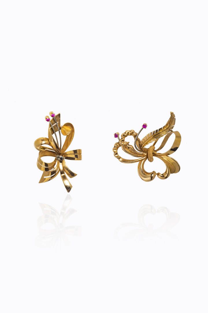 Peso gr 1u2 4 Cm 4 5x4 e 5x2 in oro rosa anni '50 a forma di volute con piccoli rubini.
