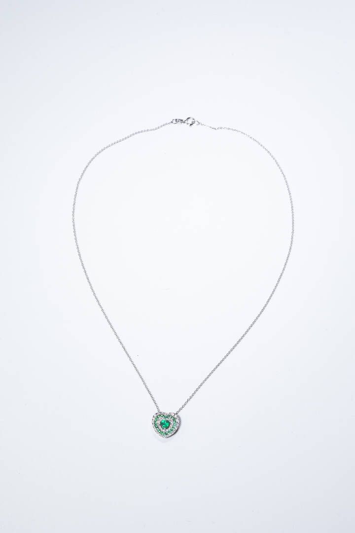 Peso gr 2 8 in oro bianco a forma di cuore con file di diamanti taglio brillante per totali ct 0 18ca probabile colore G-H purezza IF-VVS e fila di smeraldi taglio rotondo per totali ct 0 70 ca al centro smeraldo taglio a cuore di ct 0 35 ca.