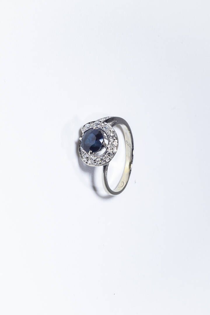 Peso gr 2 9 Misura 9 (49) in oro bianco con al centro zaffiro taglio rotondo di ct 0 90 ca e diamanti taglio 8/8 per totali ct 0 20 ca.