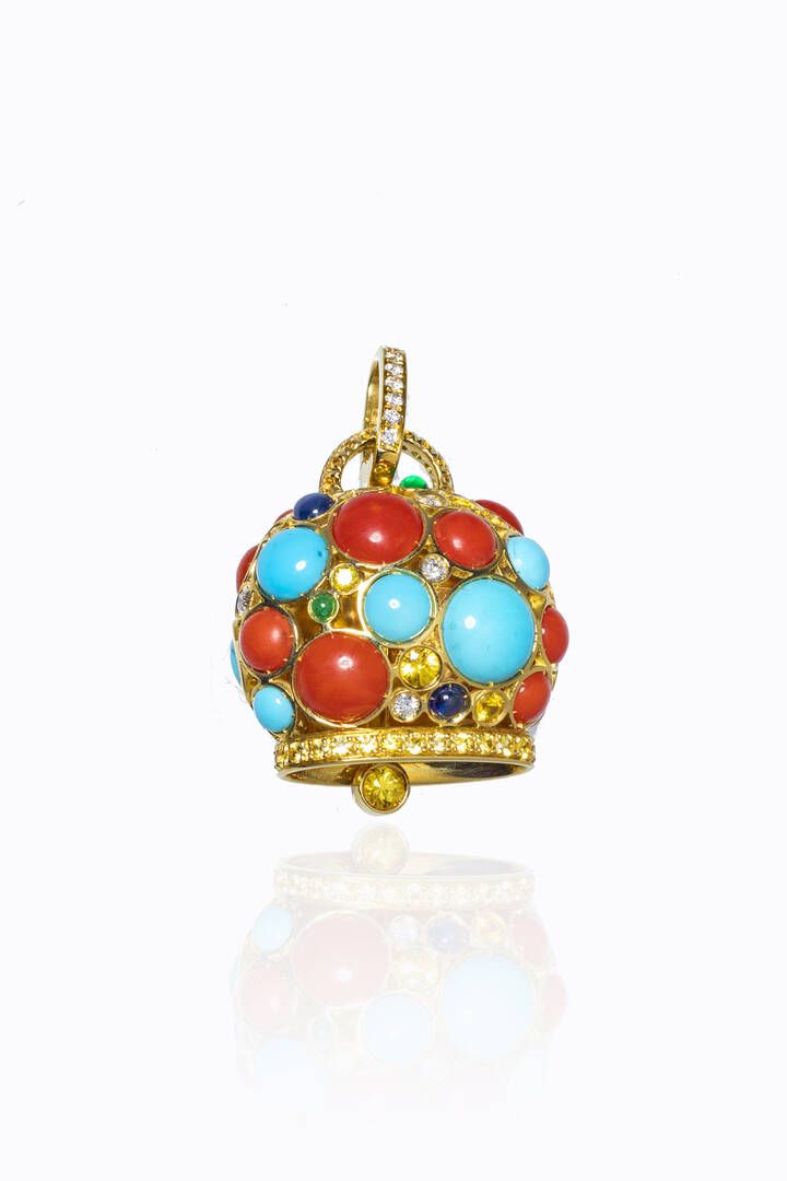 Peso gr 20 4 Cm 4x3 Ciondolo in oro giallo firmato Chantecler linea Campanelle Capri 1947 modello grande con diamanti taglio brillante per totali ct 0 30 ca probabile colore G-H purezza IF-VVS corallo rosso e turchese cabochon. Zaffiri gialli per totali ct 1 80 ca azzurri cabochon per totali ct 0 56 ca smeraldi cabochon per totali ct 0 16 ca.