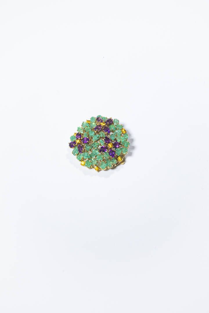 Peso gr 24 Diam. cm 4 in oro giallo di forma rotonda con foglie di smeraldo per totali ct 20 incise e fiori tremblant in ametiste per totali ct 8 0 ca e quarzi gialli per totali ct 1 50 ca.