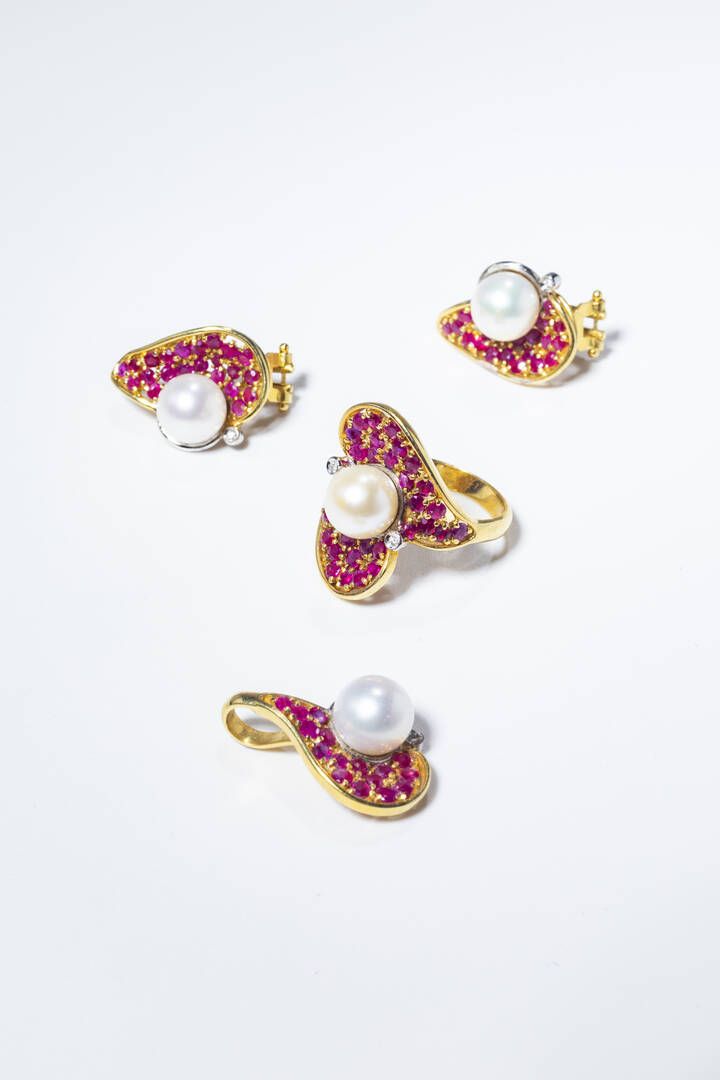 Peso gr 25 5 Misura 16 (56) in oro giallo e bianco composta da coppia di orecchini anello e ciondolo con perle giapponesi del diam di mm 9 ca pavé di rubini taglio rotondo per totali ct 5 0 ca e diamanti taglio brillante per totali ct 0 06 ca.