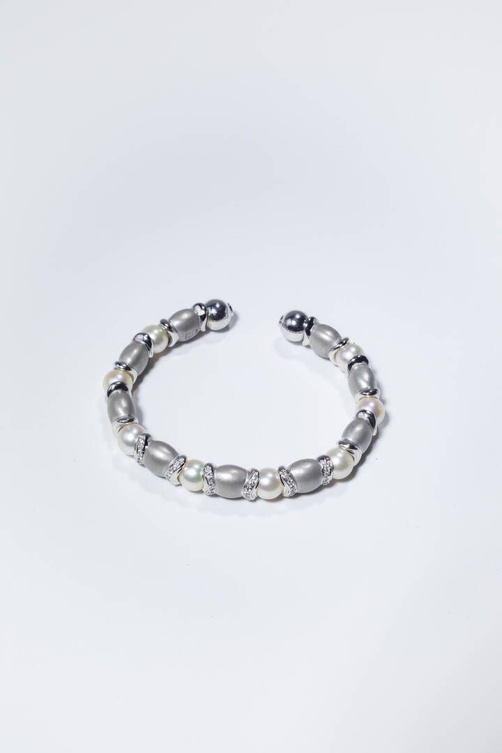 Peso gr 26 3 rigido in oro bianco sommità con segmenti satinati alternati a perle giapponesi del diam. di mm 8 ca e diamanti taglio brillante per totali ct 0 30 ca.