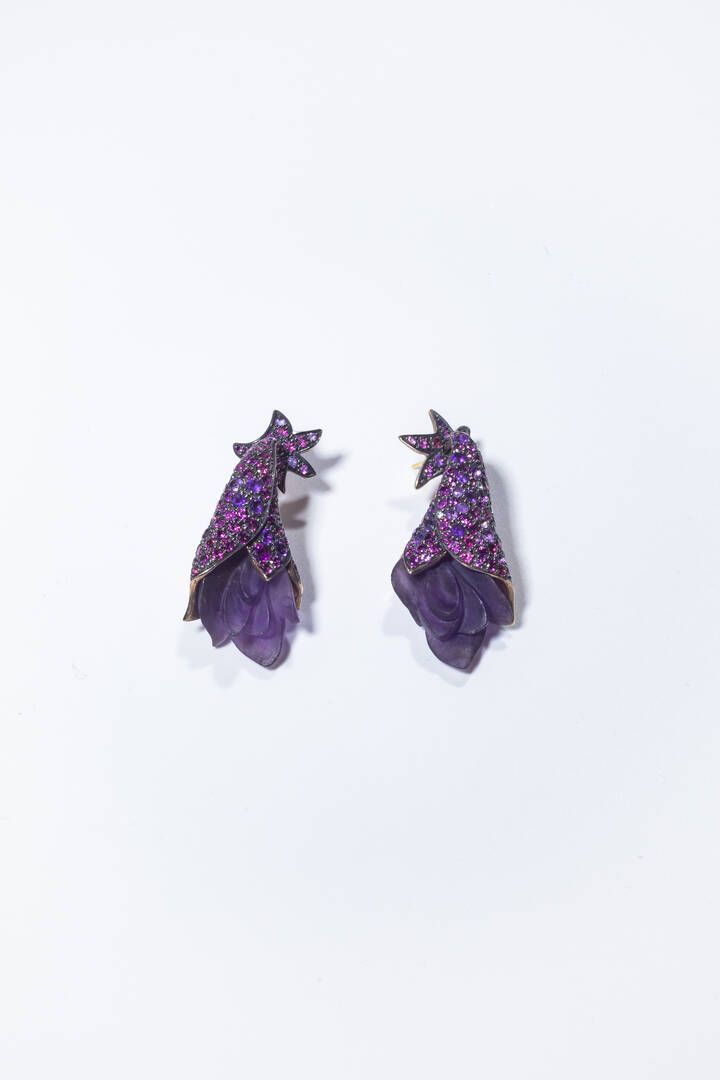 Peso gr 26 pendenti in oro rosa 9 Kt e parte anteriore brunita; corpo con zaffiri rosa taglio rotondo per totali ct 10 0 terminanti con fiori in ametiste incise.