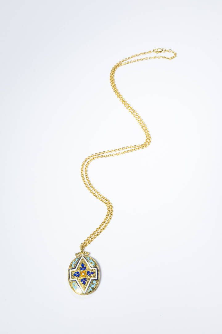 Peso gr 28 3 Lunghezza cm 60 in oro giallo con ciondolo ovale con smalti policromi e all'interno due vani portafoto (senza vetro).