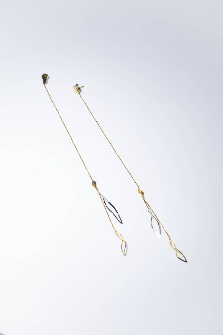 Peso gr 3 5 Lunghezza cm 17 in oro giallo e bianco a filo lavorato da cui dipartono elementi geometrici rigidi.