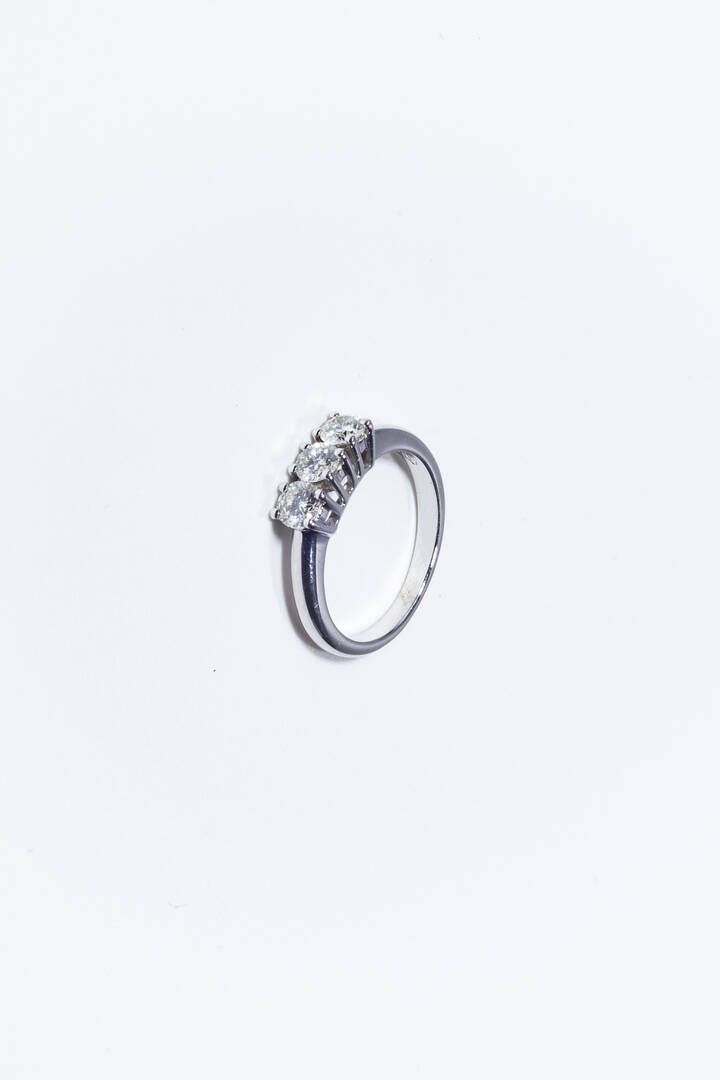 Peso gr 3 5 Misura 10 (50) in oro bianco modello trilogy con tre diamanti taglio brillante per totali ct 0 63 ca probabile colore H purezza VS.