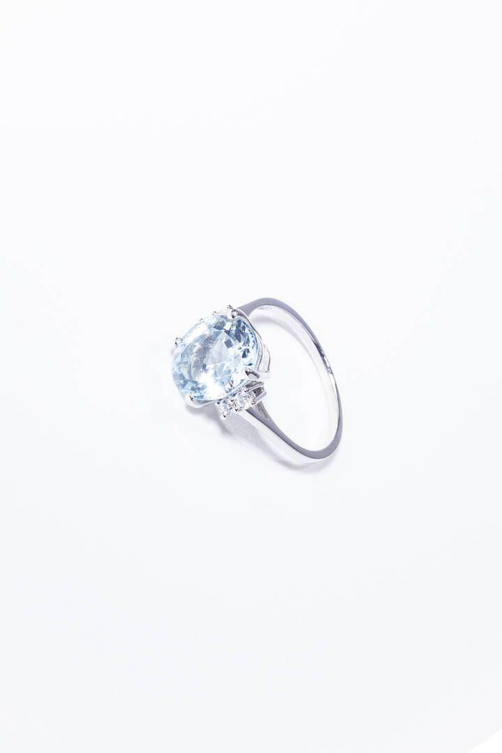 Peso gr 3 6 Misura 13 (53) in oro bianco sommità con al centro acquamarina taglio ovale di ct 3 42 ca ed ai lai quattro diamanti taglio brillante per totali ct 0 12ca.