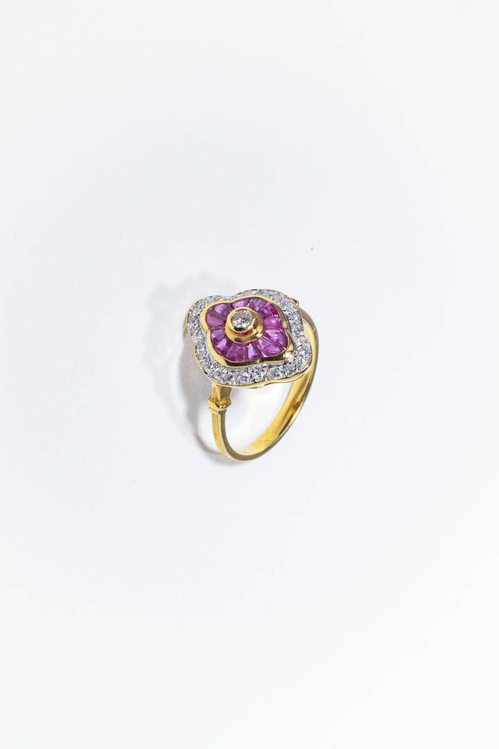 Peso gr 3 7 Misura 15 (55) in oro giallo anni '80 sommità a losanga con rubini taglio trapezio per totali ct 0 61 ca e diamanti taglio brillante per totali ct 0 30 ca probabile colore G-H purezza IF-VVS.