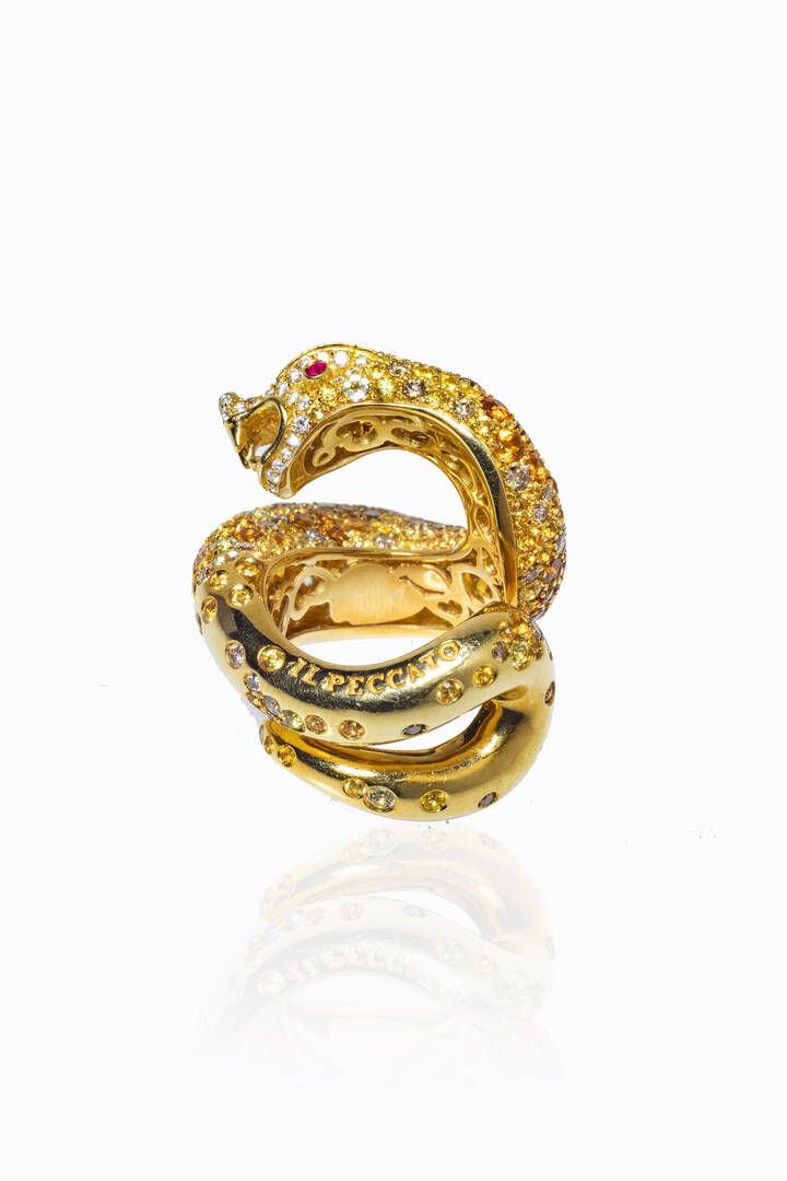 Peso gr 32 5 Misura 16 (56) Importante anello in oro giallo firmato “Pasquale Bruni” a forma di serpente modello il peccato interamente in pavé di diamanti taglio brillante di colore bianco e cognac per totali ct 2 01 ca zaffiri gialli per totali ct 3 26 ca. Due rubini come occhi.