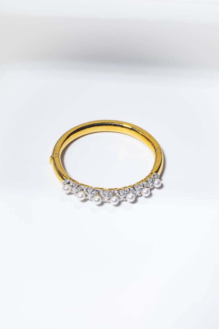 Peso gr 33 7 Diam. interno cm 5x5 5 rigido in oro giallo e bianco sommità decorata con perle giapponesi del diam. di mm 6 ca e diamanti taglio brillante per totali ct.1 20 ca.