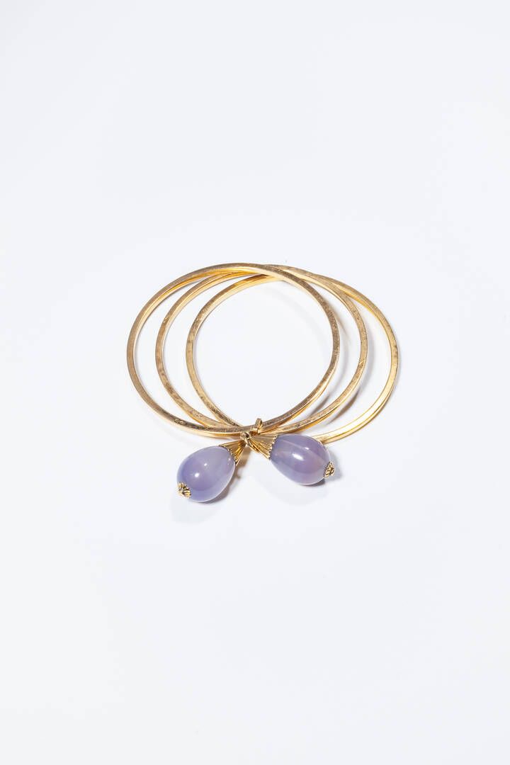 Peso gr 36 2 Diam. interno cm 6 5 composto da tre fasce rigide in oro giallo raccordate da due gocce pendenti di calcedonio.