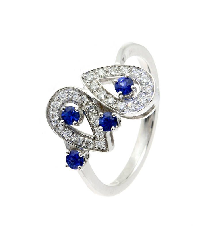 Peso gr 4 1 Misura15 in oro bianco sommità composta da due gocce in diamanti taglio brillante per totali ct 0 23 ca e piccoli zaffiri taglio rotondo per totali ct 0 32 ca.