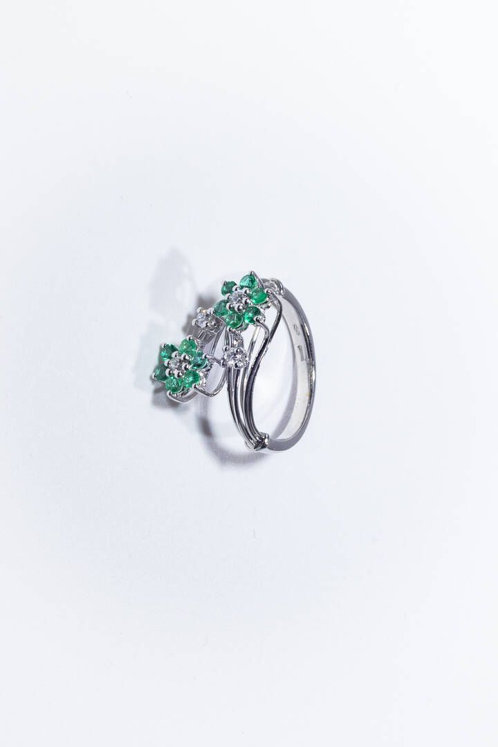 Peso gr 4 6 Misura 16 5 (56 5) in oro bianco sommità con due fiori disposti a contrarié con smeraldi taglio rotondo per totali ct 0 44 ca e diamanti taglio brillante per totali ct 0 18 ca probabile colore G-H purezza IF-VVS.