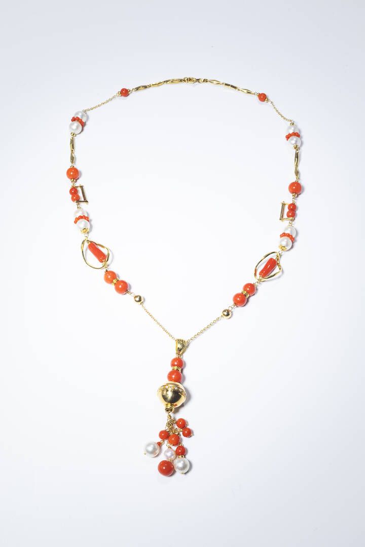 Peso gr 43 9 Lunghezza cm 52 in oro giallo con perle di acqua dolce alternate a sfere di corallo rosso mediterraneo di varie misure; dischi in oro giallo lavorato; al centro pendente con sfera in oro giallo e diamanti taglio brillante per totali ct 0 20 ca probabile colore G-H purezza IF-VVS terminante con frange in sfere di corallo rosso mediterraneo e perle di acqua dolce. Corredato di certificato telematico del gemmologo Caviglia di Roma.