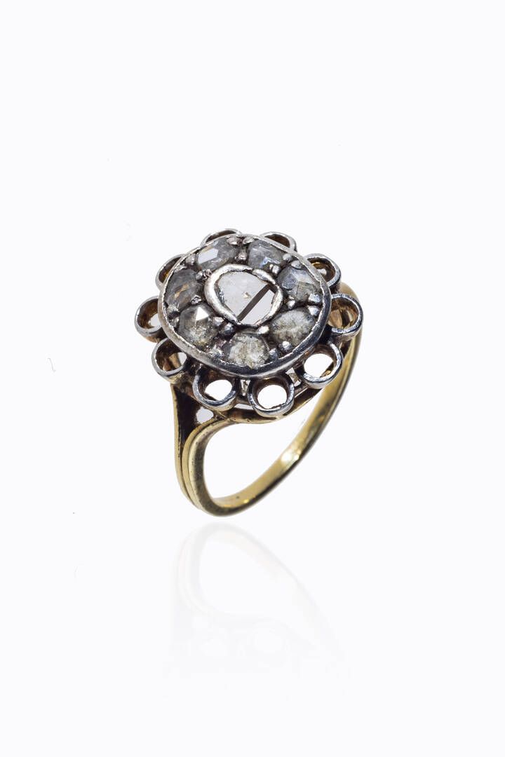 Peso gr 5 4 Misura 15 (55) in oro giallo a bassa caratura ed argento sommità di forma rotonda con rosette (centrale rotta) per totali ct 0 70 ca.