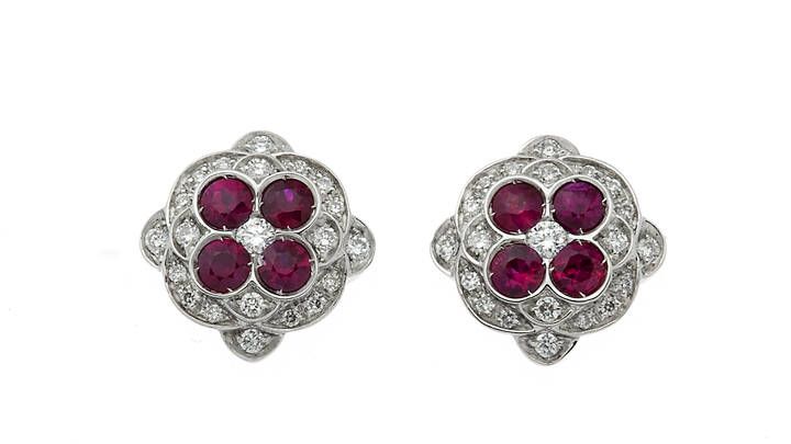 Peso gr 5 5 in oro bianco a lobo di forma fantasia con otto rubini taglio rotondo per totali ct 0 78 ca e diamanti taglio brillante a decoro.