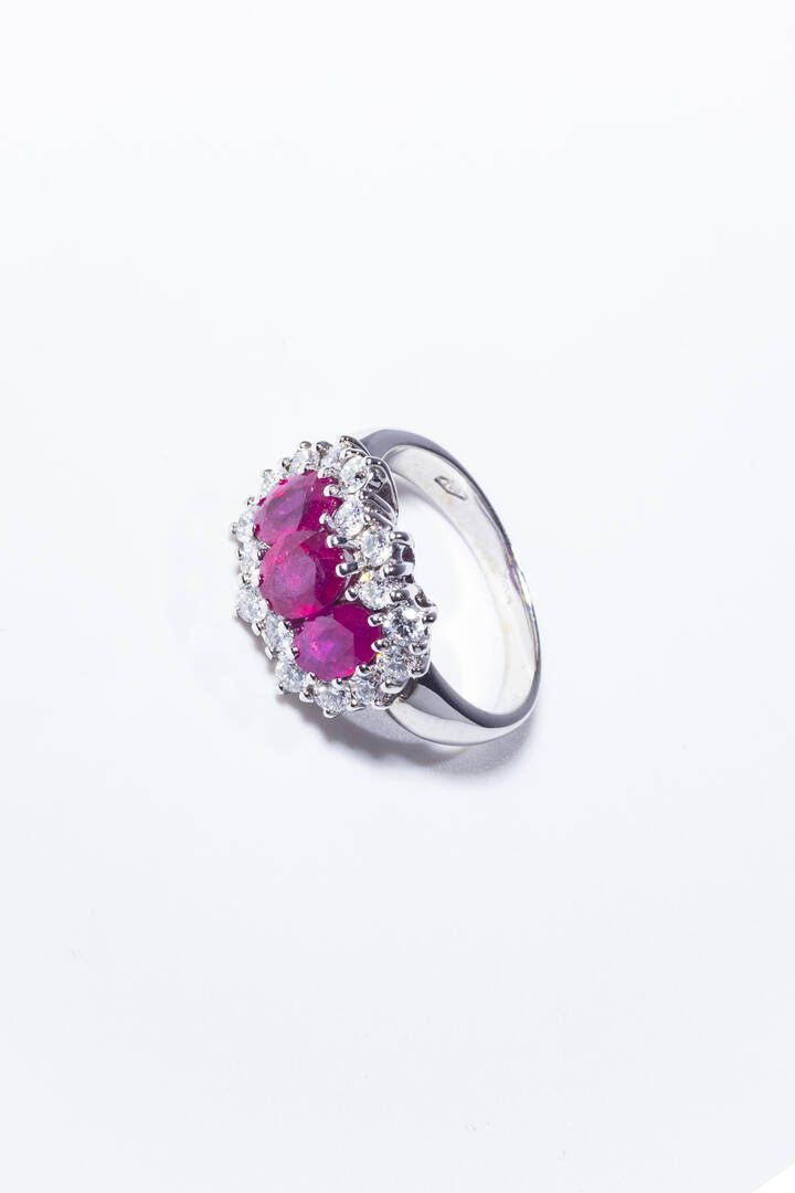 Peso gr 6 0 Misura 13 in oro bianco sommità con al centro tre rubini taglio ovale per totali ct 2 30 ca e diamanti taglio brillante per totali ct 0 65 ca probabile colore G-H purezza IF-VVS.