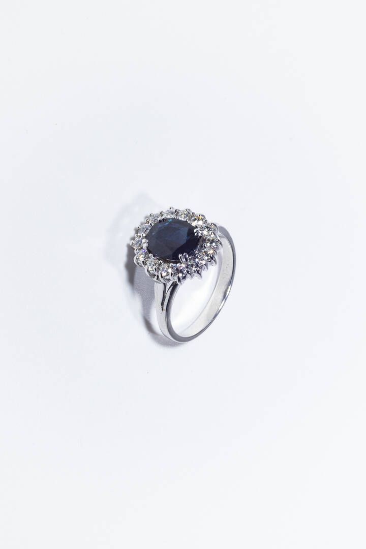 Peso gr 6 1 Misura 14 (54) in oro bianco con al centro zaffiro taglio ovale di ct 2 20 ca e contorno di diamanti taglio brillante per totali ct 0 70 ca probabile colore G-H purezza IF-VVS.