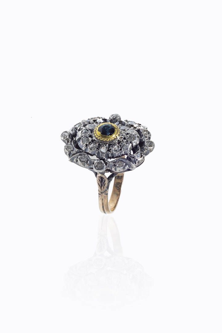 Peso gr 6 5 Misura 15 (55) in oro giallo a bassa caratura ed argento sommità ovale con al centro zaffiro e rosette di diamanti per totali ct 0 40 ca.