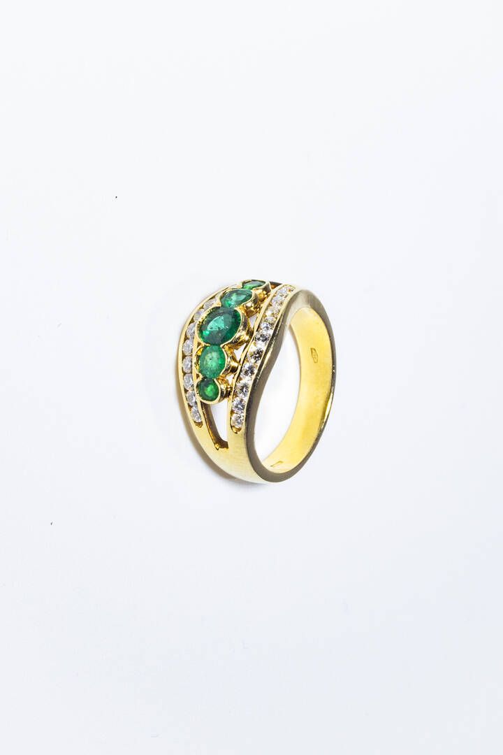 Peso gr 6 9 Misura 14 (54) in oro giallo sommità con due fasce in diamanti taglio brillante per totali ct 0 30 ca e al centro smeraldi taglio rotondo per totali ct 0 50 ca.