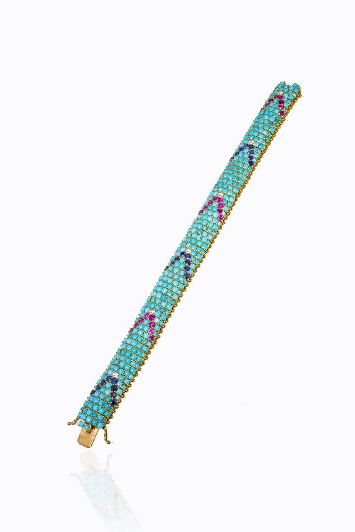 Peso gr 67 7 Lunghezza cm 19 in oro giallo anni '60 con turchesi cabochon e file di rubini zaffiri taglio rotondo per totali ct 3 0 ca e diamanti taglio brillante per totali ct 0 20 ca.