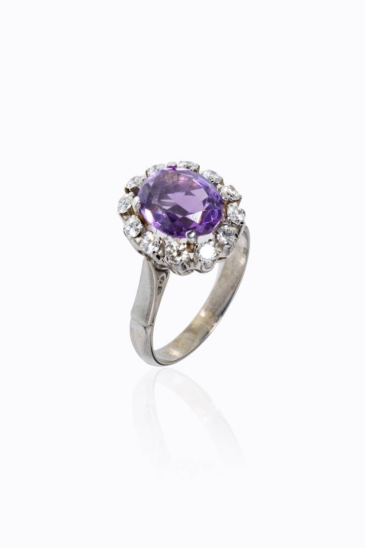 Peso gr 7 6 Misura 20 5 (60 5) in oro bianco a margherita con al centro ametista taglio ovale contornata da diamanti taglio brillante per totali ct 0 50 ca.