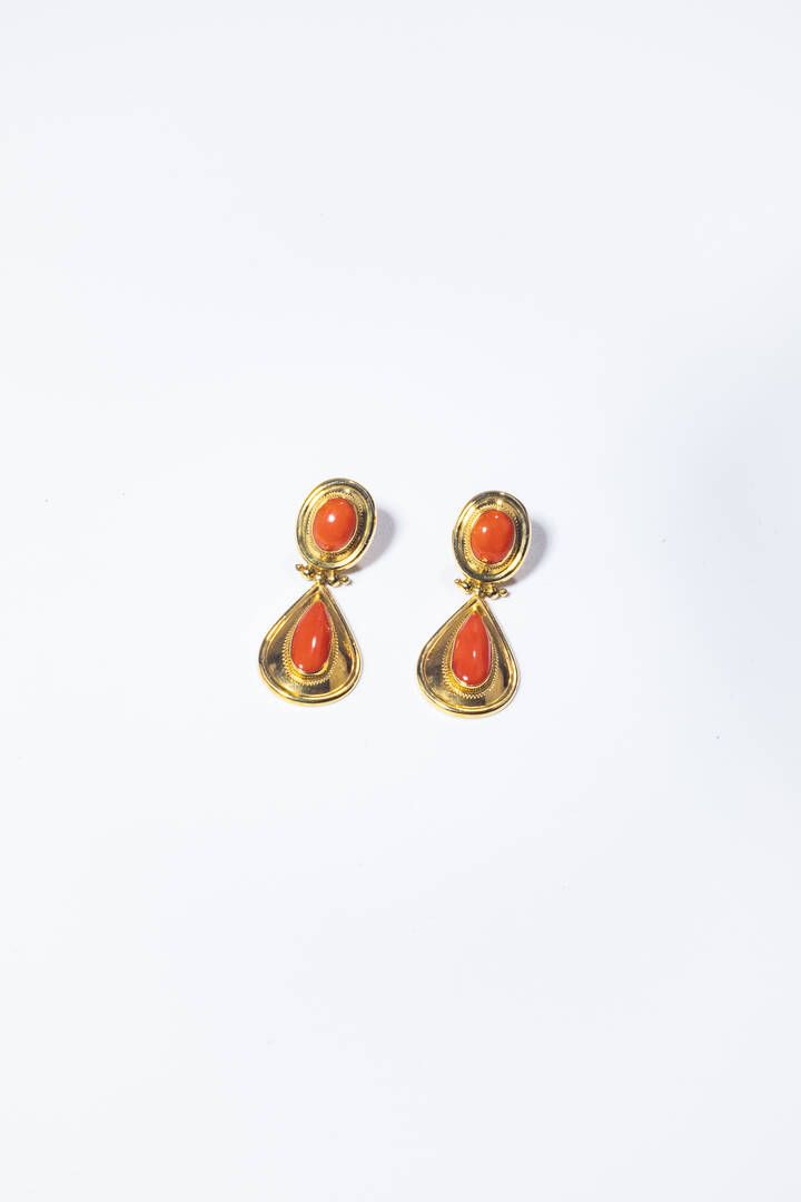 Peso gr 8 3 in oro giallo pendenti con coralli mediterranei taglio a goccia e ovali. Accompagnato da certificato telematico di autenticità Ce.S.Ar. Centro Studi Archeometrici