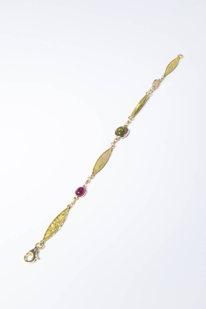 Peso gr 8 7 Lunghezza cm 20 in oro giallo composto da segmenti a losanga traforati e satinati alternati ad un rubino un peridoto ed uno zaffiro cabochon.