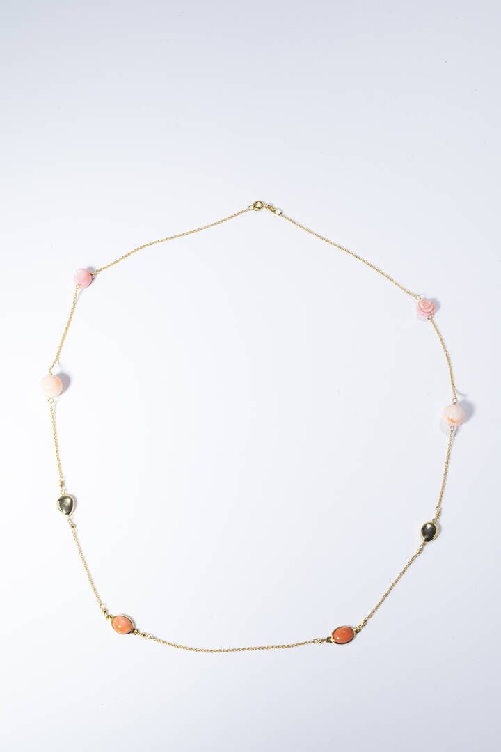 Peso gr 8 7 Lunghezza cm 58 in oro giallo con sfere ovali e rose in corallo rosa e cabochon. Certificato telematico del gemmologo Caviglia di Roma.