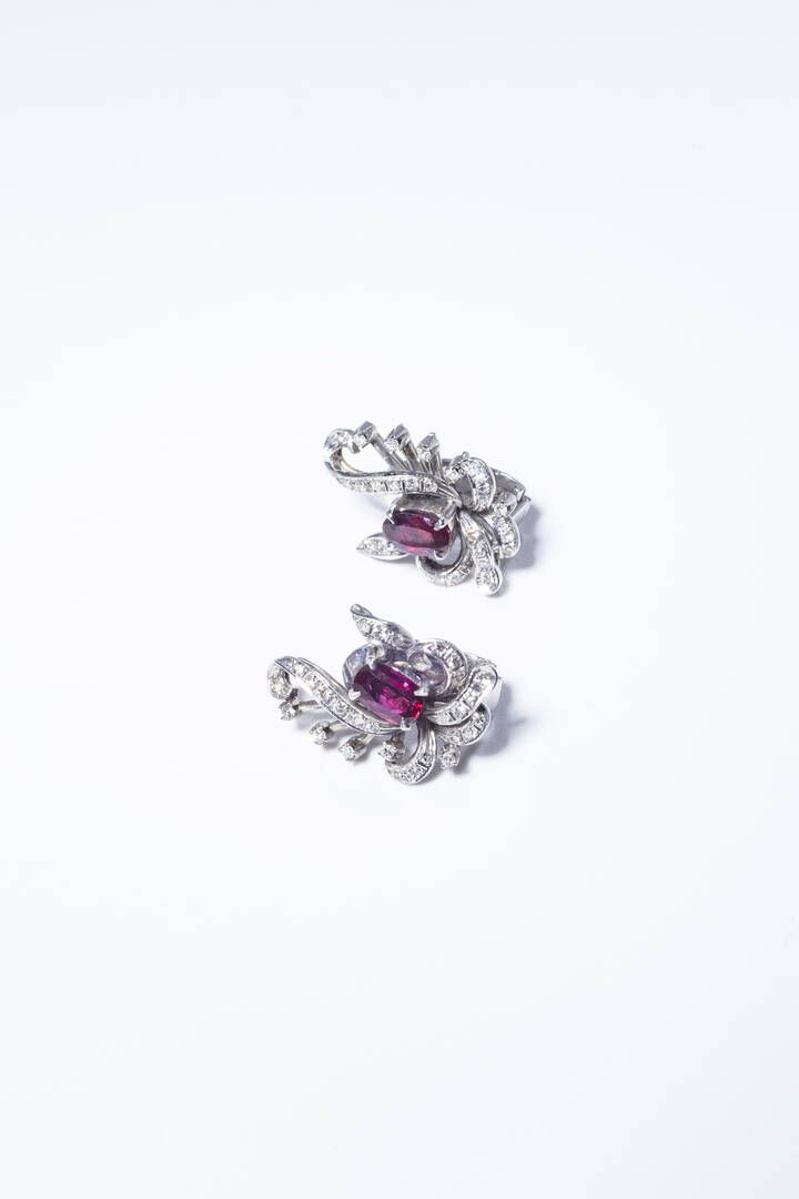 Peso gr 9 2 in oro bianco a clip anni '50 a forma di volute in diamanti taglio 8/8 per totali ct 0 50 ca e due rubini taglio ovale per totali ct 2 30 ca.