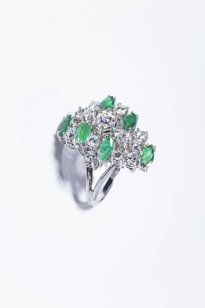 Peso gr 9 5 Misura 17 (57) in oro bianco sommità a cespuglio con diamanti taglio brillante per totali ct 1 20 ca e smeraldi taglio navette per totali ct 1 0 ca.