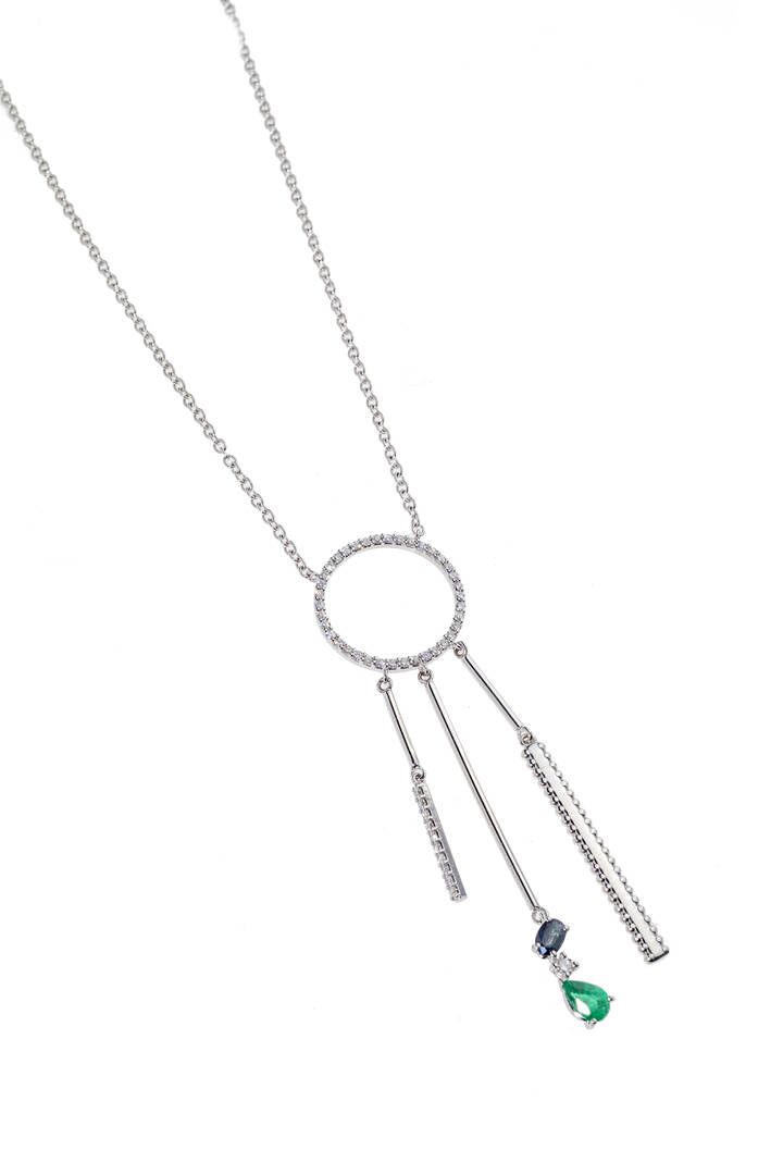 Peso gr 9 8 in oro bianco con cerchio in diamanti taglio brillante per totali ct 0 53 ca probabile colore G-H purezza IF-VVS da cui dipartono tre frange di cui una terminante con uno smeraldo taglio a goccia di ct 0 36 ca ed uno zaffiro taglio ovale di ct 0 28 ca.