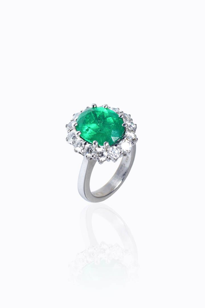 Peso gr10 5 Misura 12 (52) Anello in oro bianco sommità di forma ovale firmato Tiburzi al centro smeraldo colombiano taglio ovale di ct 5 88 contornato da diamanti taglio brillante per totali ct 2 10 ca. Certificato Gubelin dello smeraldo