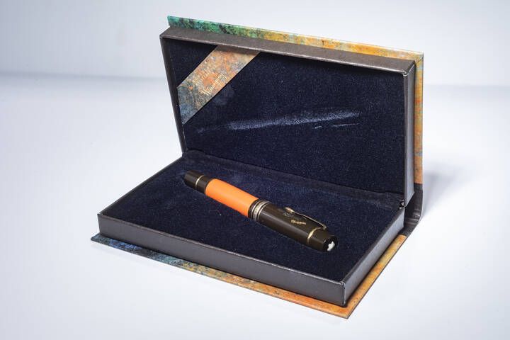 Stilografica Montblanc modello Meisterstuck serie limitata H. Hemingway. Corpo e cappuccio bicolore in resina nera e arancio. Corredata di scatola controscatola e libretto.