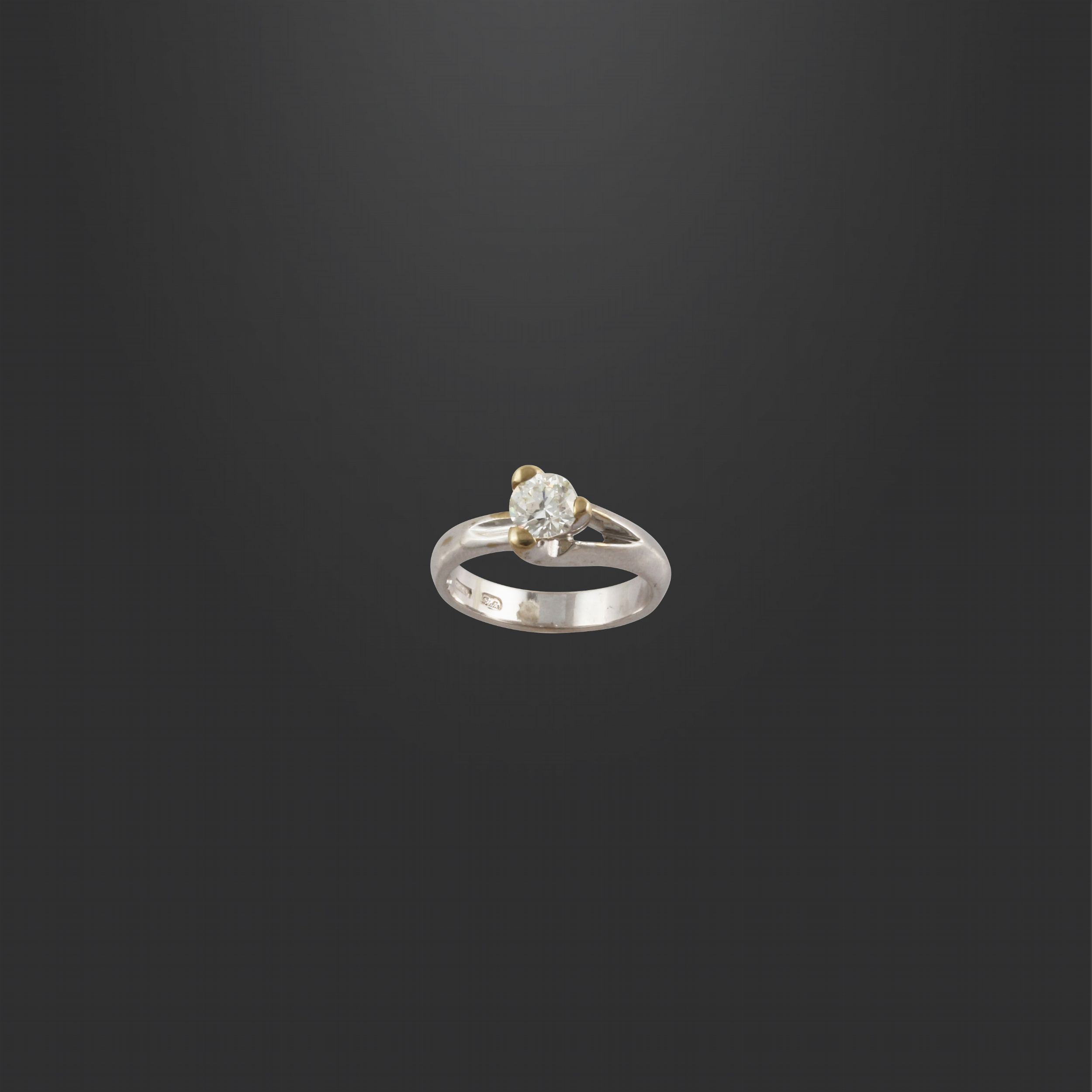 in oro bianco con gambo parzialmente traforato e brillante al centro del peso di 0,60 ct ca. (piccola sbeccatura), gr. 5,6.Misura 14