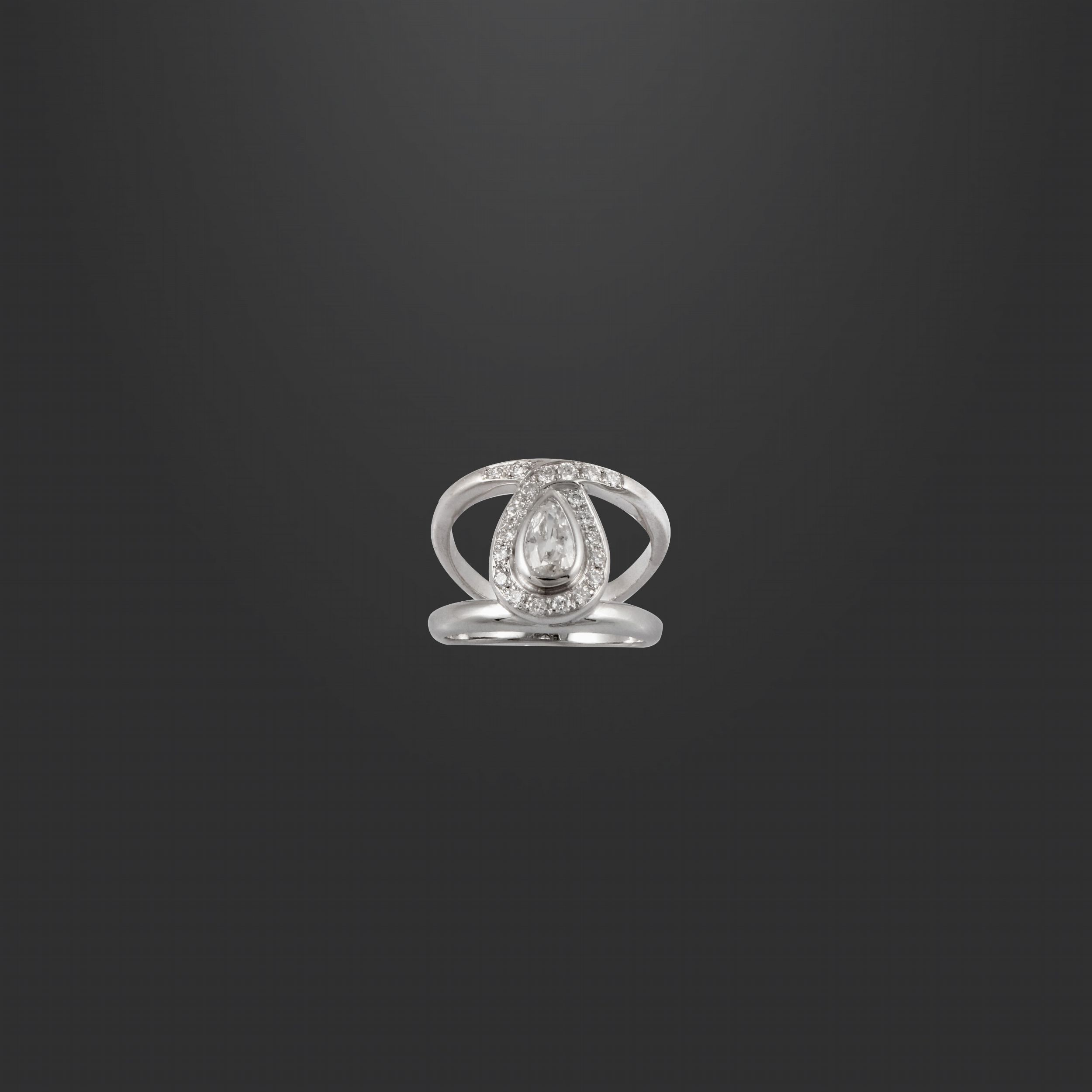 in oro bianco con doppio gambo evidenziato al centro da un diamante a goccia del peso di 0,50 ct ca. contornato da piccoli brillanti, gr. 9,3.