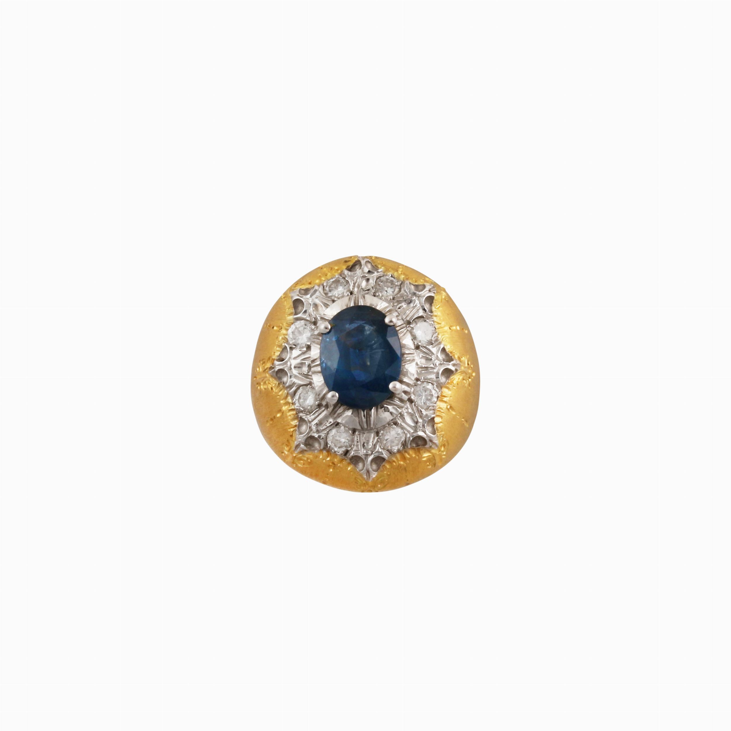 a fascia bombata e satinata in oro giallo e bianco con zaffiro ovale del peso di 2,60 ct ca. e brillanti del peso complessivo di 0,40 ct ca., gr. 19,5.