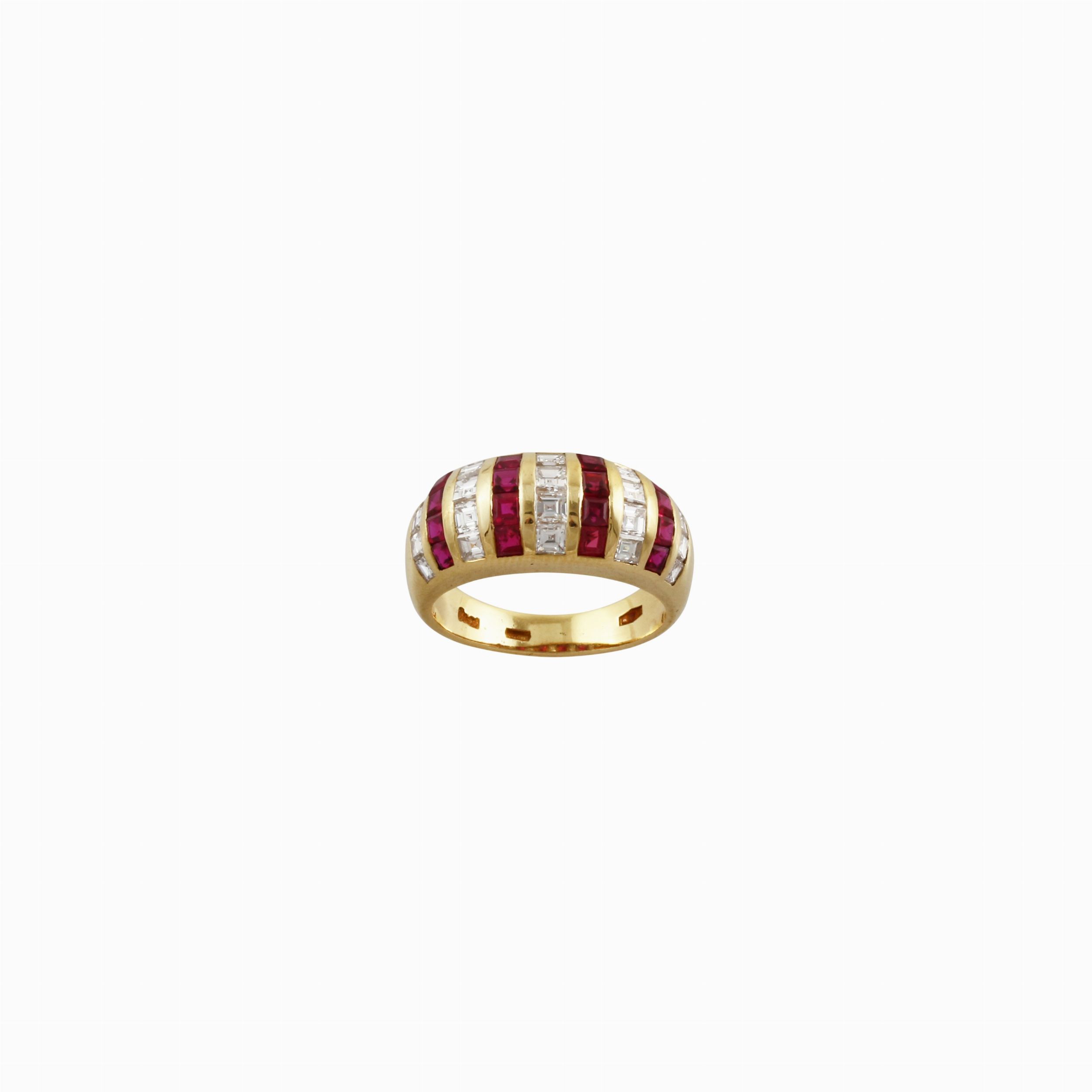 in oro giallo a fascia bombata con rubini e diamanti carré, gr. 6,7.