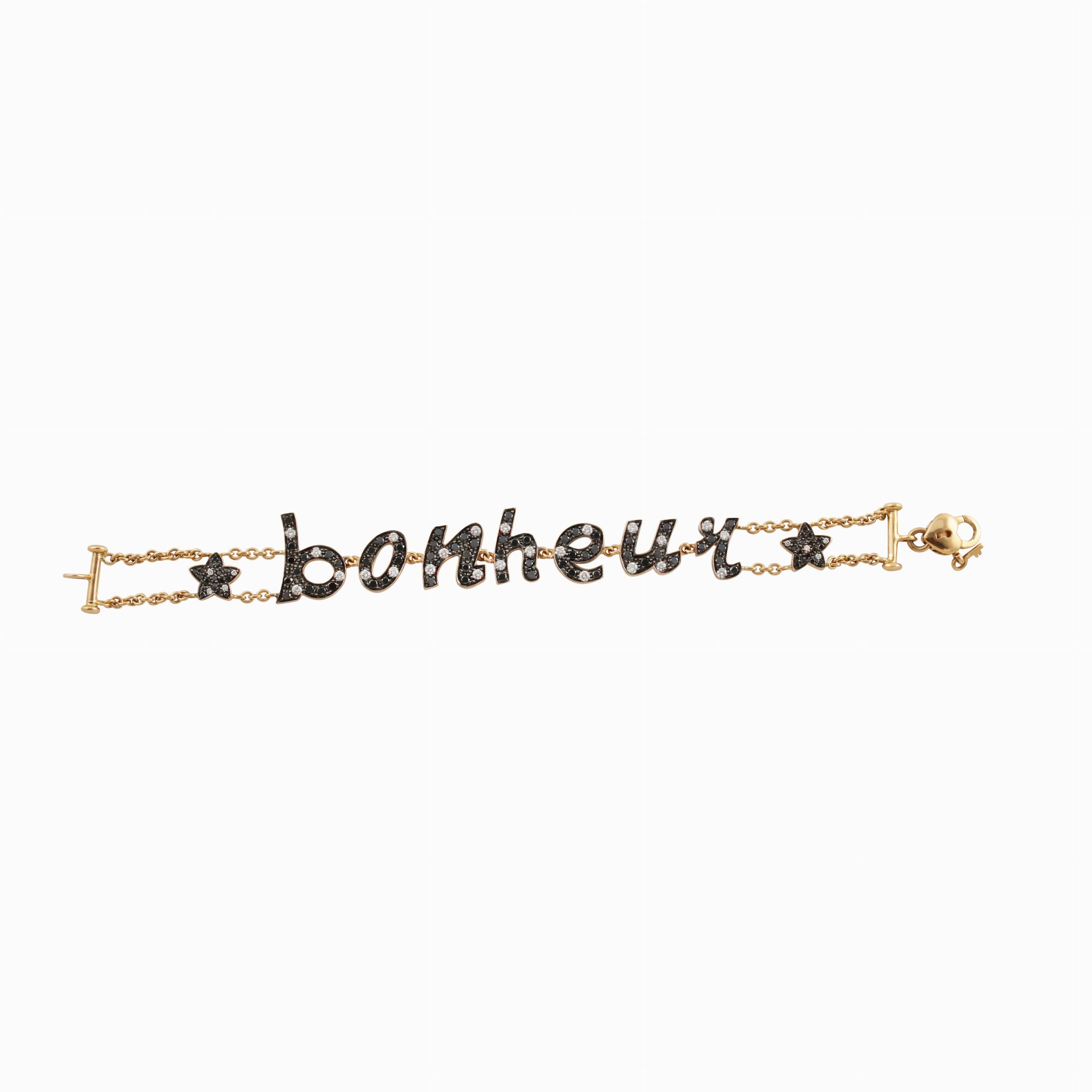 in oro rosa recante la scritta Bonheur con diamanti neri e incolori del peso complessivo di 2,60 ct ca., chiusura a moschettone con piccola chiave sospesa, gr. 17,6.Lunghezza 16 cmNumerario: 3130 AL (Crivelli - Valenza)