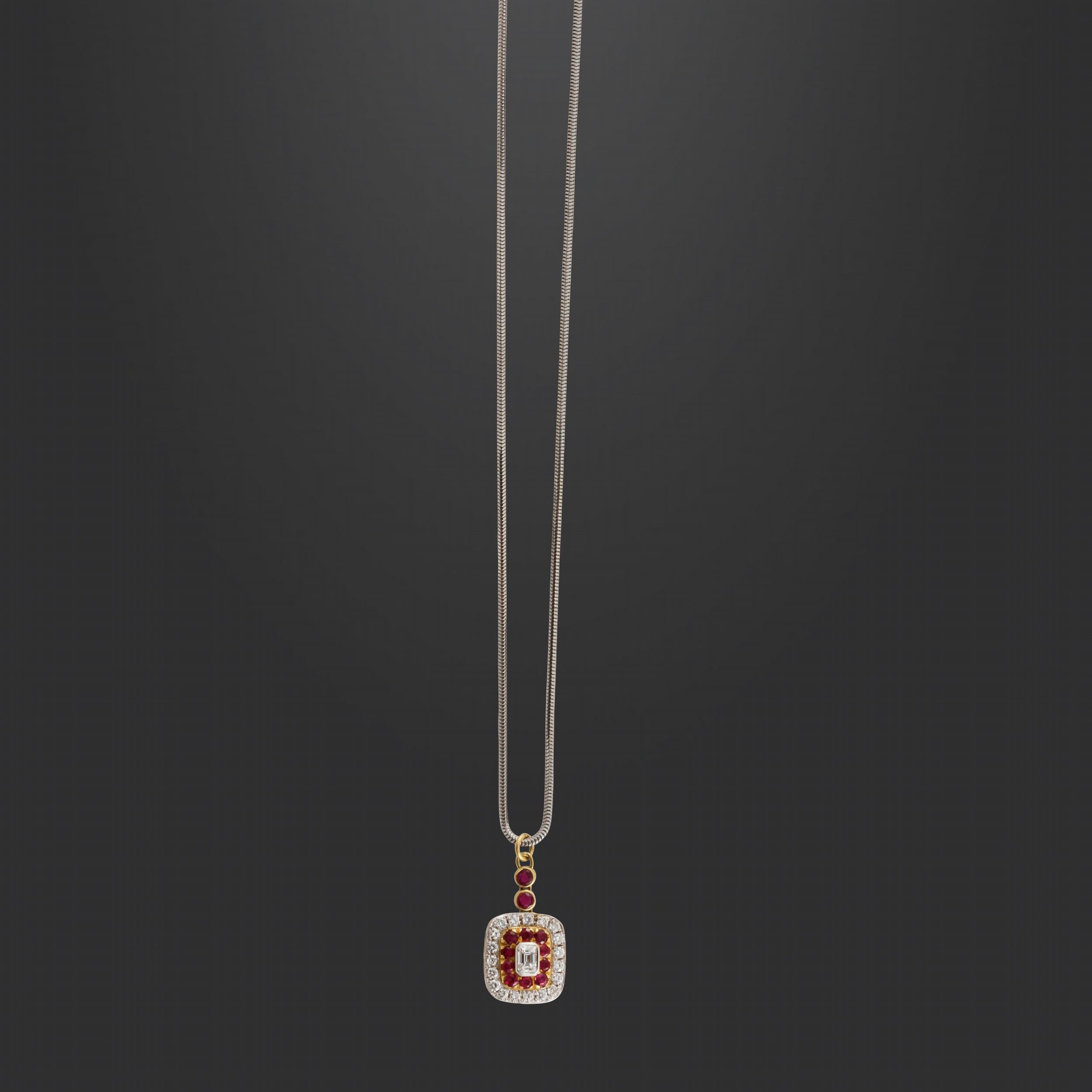 girocollo in oro bianco a coda di topo con pendente in oro giallo e bianco a forma geometrica ornato da rubini e diamanti del peso complessivo di 0,30 ct ca., gr complessivi 8,2.Lunghezza 40 cm