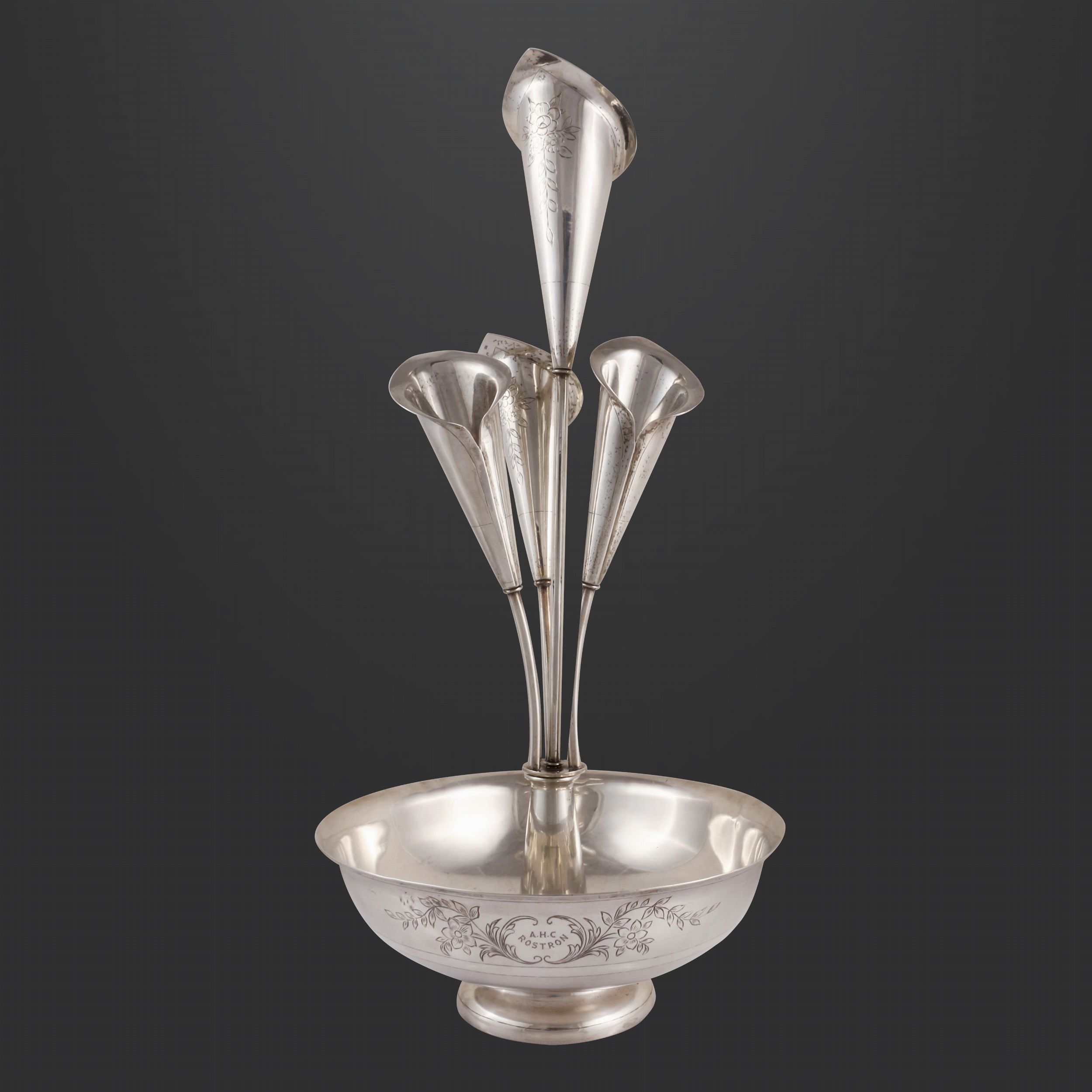 in argento liscio a corpo circolare cesellato a motivi floreali sormontato da tre calle su stelo, recante la scritta A.H.C. ROSTRON, gr. 900 ca. (lievi difetti).Diametro 20 cm, altezza 42 cm ca.