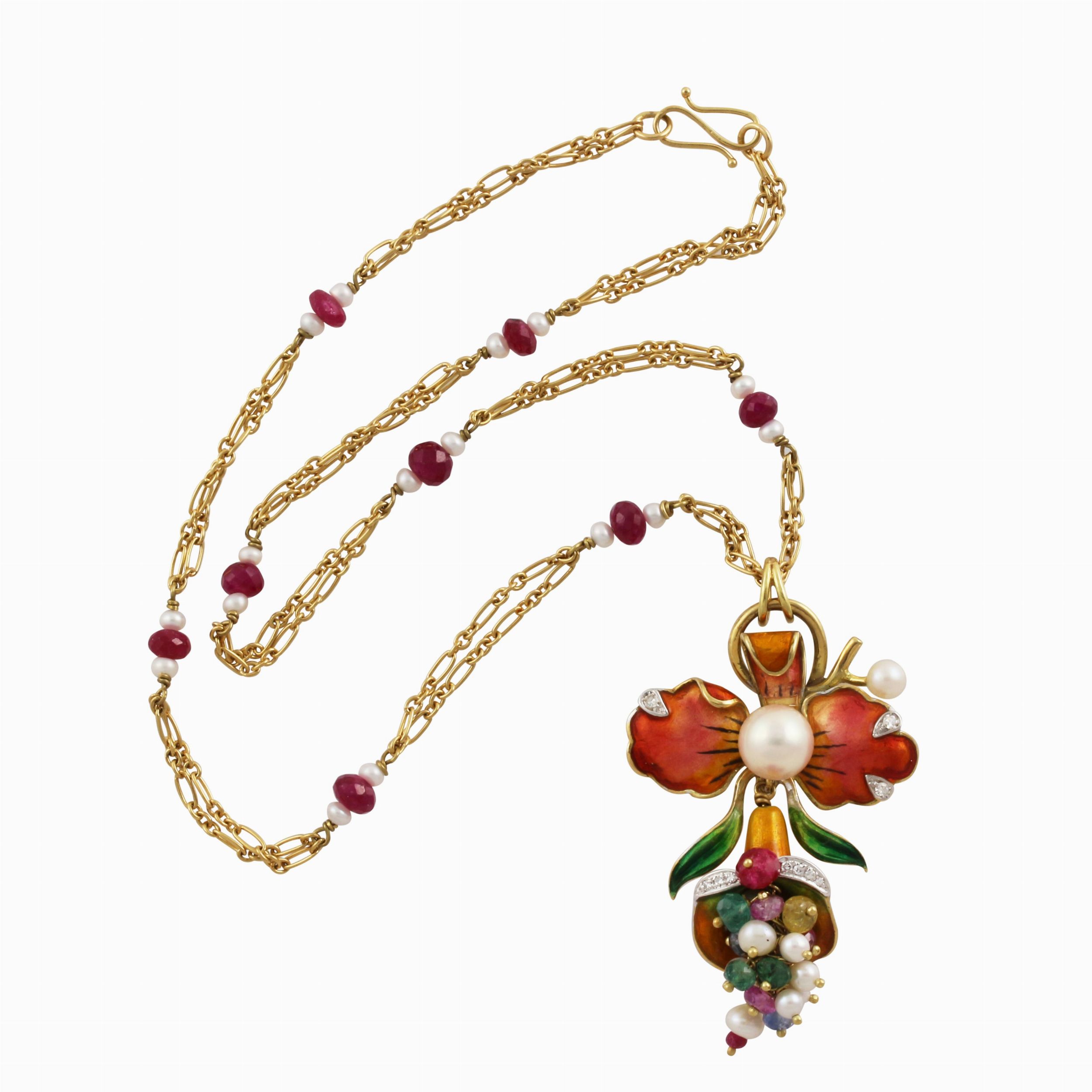 in oro giallo e bianco con fiore pendente ornato da smalti policromi, perle d'acqua dolce, piccoli diamanti e gemme, sostenuto da una doppia catena intervallata da perle d'acqua dolce e rubini, gr. 23,6.Lunghezza 40 cm
