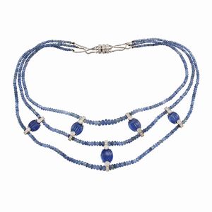 a tre fili di zaffiri a rondelle sfaccettate evidenziato anteriormente da cinque motivi in oro bianco ciascuno [..]