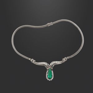 in oro bianco a titolo basso, evidenziato al centro da motivi a volute con brillanti del peso di 2 ct ca. e smeraldo [..]
