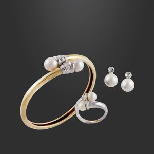composto da bracciale rigido contrarié, anello e orecchini in oro con perle e brillanti, gr. complessivi 27,9. [..]