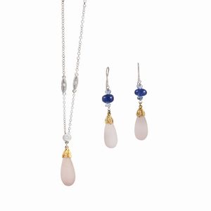 composto da collana e orecchini pendenti in oro bianco e giallo con zaffiri, diamanti e gocce in cristallo di [..]