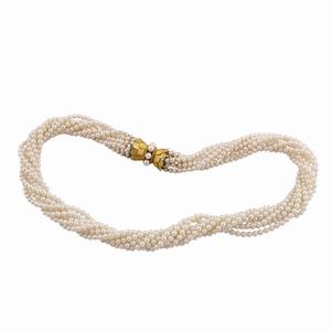 a torchon costituito da otto fili di perle con chiusura in oro giallo satinato. Lunghezza 42 cm ca.