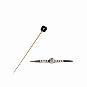 composto da spilla a barretta in argento e diamanti e spilla da cravatta in oro giallo sormontata da un'onice [..]