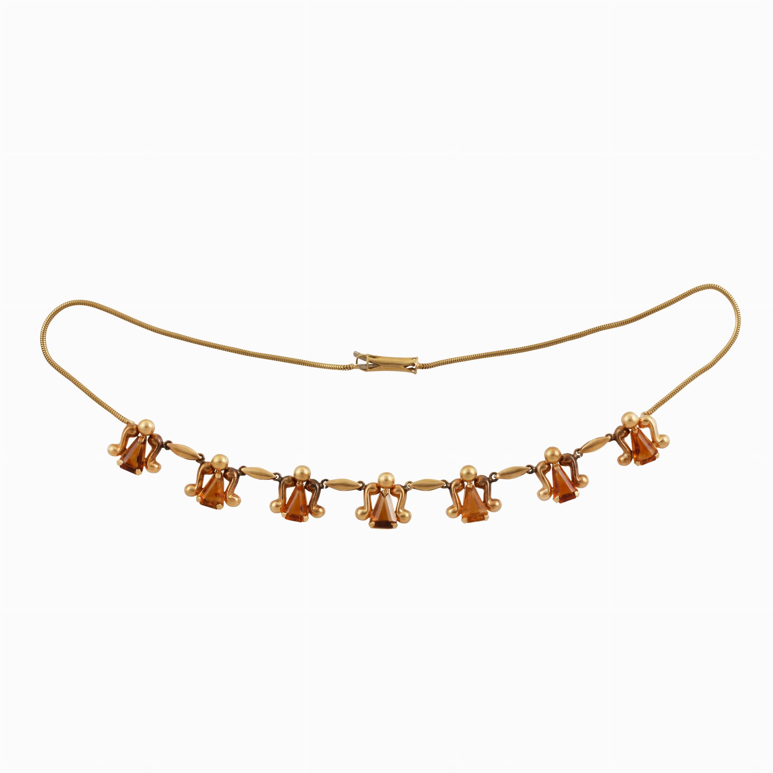in oro giallo a coda di topo con parte anteriore ornata da motivi stilizzati ciascuno con quarzo citrino, gr. 24,4.Lunghezza 42,5 cm